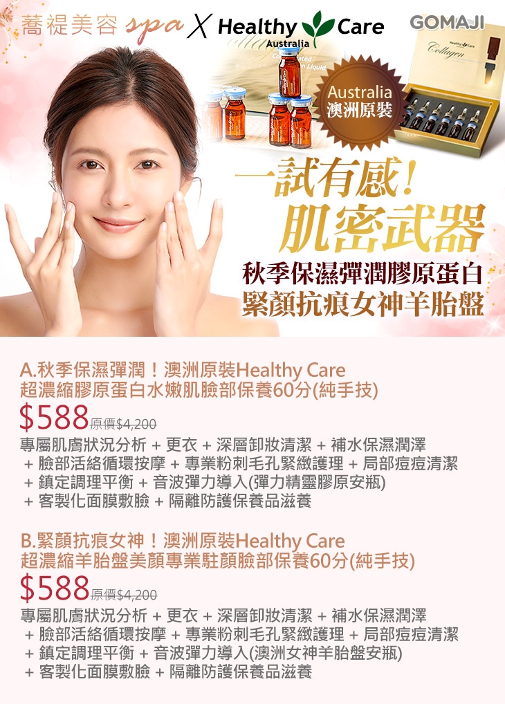 A.秋季保濕彈潤!澳洲原裝Healthy Care超濃縮膠原蛋白水嫩肌臉部保養60分(純手技) / B.緊顏抗痕女神!澳洲原裝Healthy Care超濃縮羊胎盤美顏專業駐顏臉部保養60分(純手技)