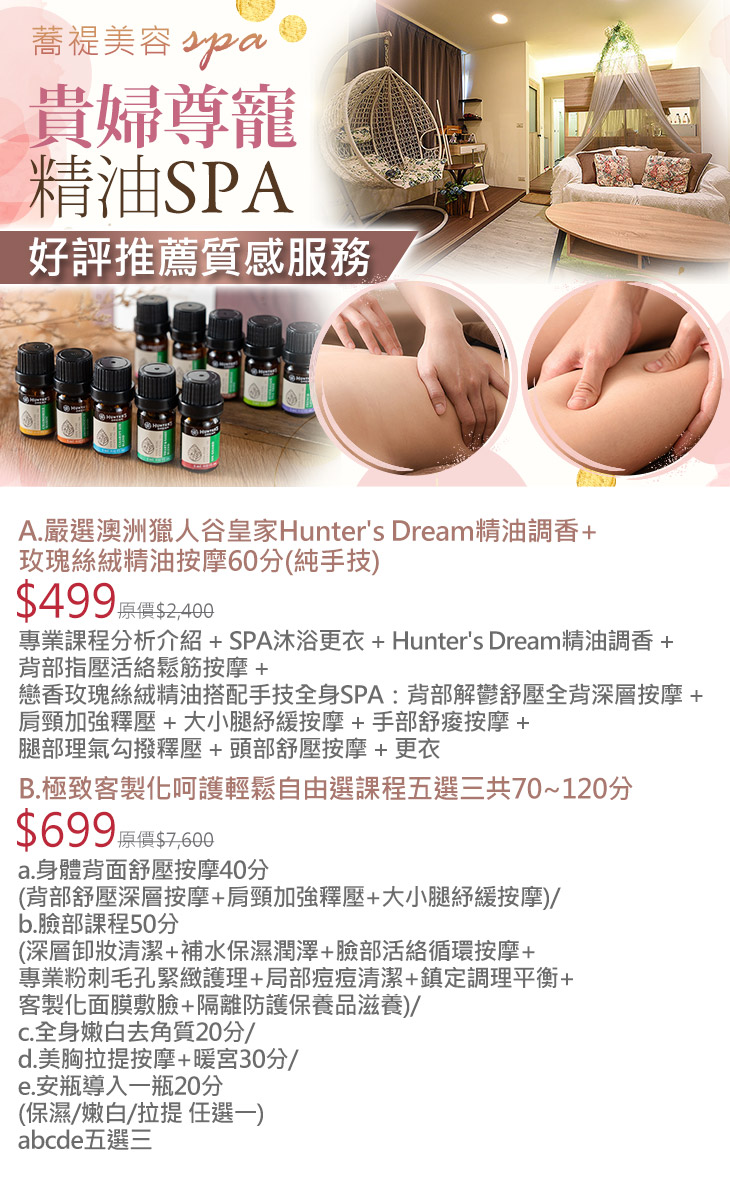 A.嚴選澳洲獵人谷皇家Hunter's Dream精油調香+玫瑰絲絨精油按摩60分(純手技) / B.極致客製化呵護輕鬆自由選課程五選三共70~120分