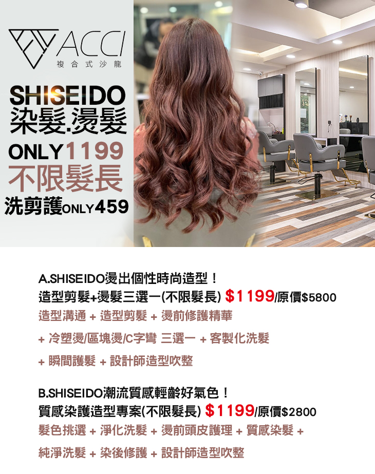 A.SHISEIDO燙出個性時尚造型!造型剪髮+燙髮三選一(不限髮長) / B.SHISEIDO潮流質感輕齡好氣色!質感染護造型專案(不限髮長)