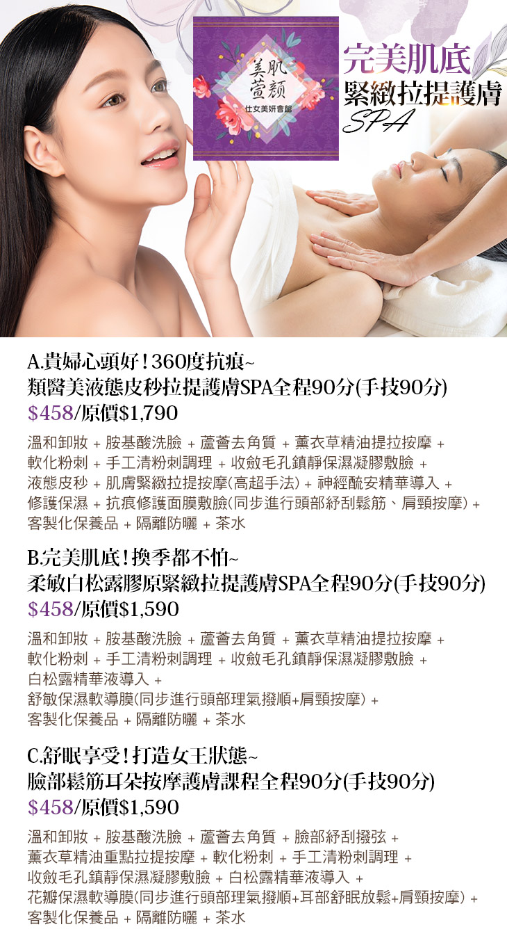A.貴婦心頭好!360度抗痕~類醫美液態皮秒拉提護膚SPA全程90分(手技90分) / B.完美肌底!換季都不怕~柔敏白松露膠原緊緻拉提護膚SPA全程90分(手技90分) / C.舒眠享受!打造女王狀態~臉部鬆筋耳朵按摩護膚課程全程90分(手技90分)