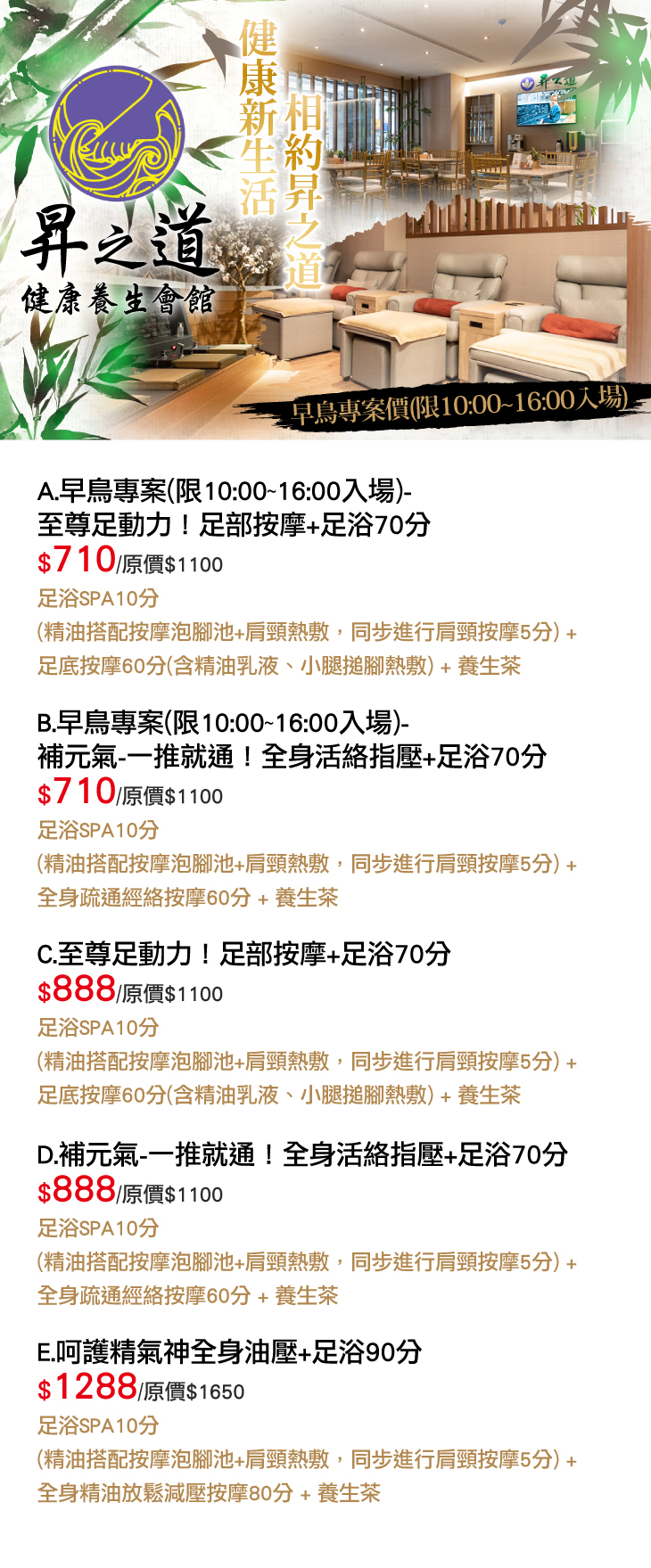 A.早鳥專案(限10:00~16:00入場)-至尊足動力!足部按摩+足浴70分 / B.早鳥專案(限10:00~16:00入場)-補元氣-一推就通!全身活絡指壓+足浴70分 / C.至尊足動力!足部按摩+足浴70分 / D.補元氣-一推就通!全身活絡指壓+足浴70分 / E.呵護精氣神全身油壓+足浴90分