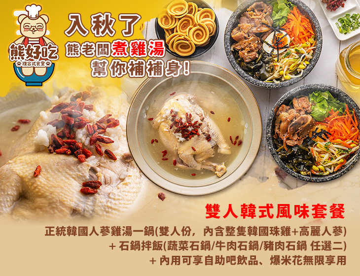 〈正統韓國人蔘雞湯一鍋(雙人份,內含整隻韓國珠雞+高麗人蔘) + 石鍋拌飯(蔬菜石鍋/牛肉石鍋/豬肉石鍋 任選二) + 內用可享自助吧飲品、爆米花無限享用〉