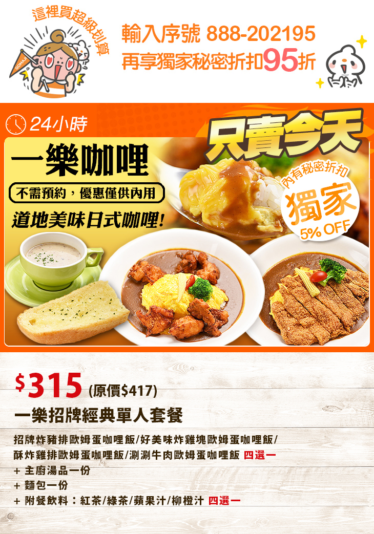〈招牌炸豬排歐姆蛋咖哩飯/好美味炸雞塊歐姆蛋咖哩飯/酥炸雞排歐姆蛋咖哩飯/涮涮牛肉歐姆蛋咖哩飯 四選一 + 主廚湯品一份 + 麵包一份 + 附餐飲料:紅茶/綠茶/蘋果汁/柳橙汁 四選一〉