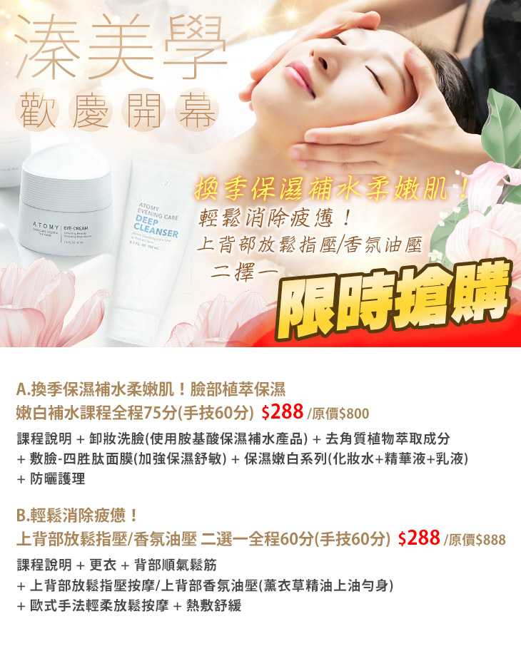 A.換季保濕補水柔嫩肌!臉部植萃保濕嫩白補水課程全程75分(手技60分) / B.輕鬆消除疲憊!上背部放鬆指壓/香氛油壓 二選一全程60分(手技60分)