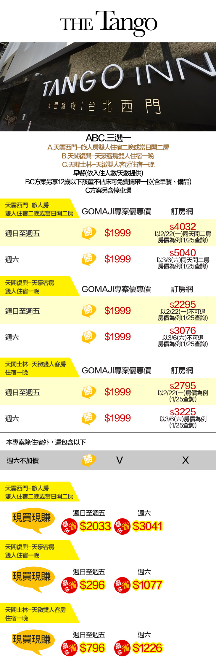 ※B、C方案另享12歲以下孩童不佔床可免費攜帶一位(含早餐、備品)。