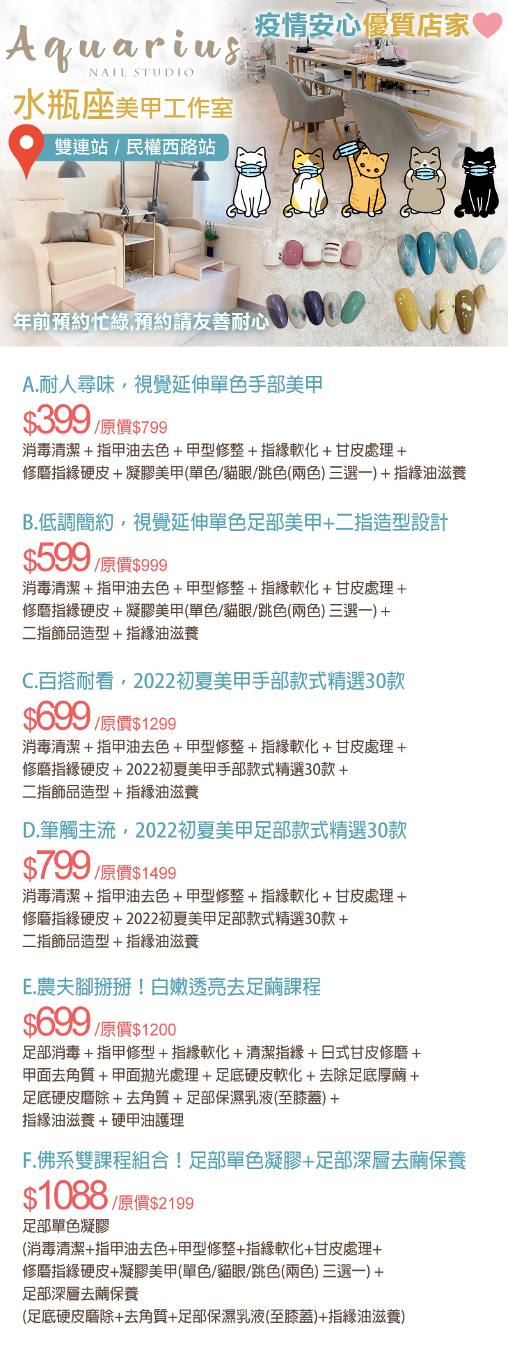 A.耐人尋味,視覺延伸單色手部美甲 / B.低調簡約,視覺延伸單色足部美甲+二指造型設計 / C.百搭耐看,2022初夏美甲手部款式精選30款 / D.筆觸主流,2022初夏美甲足部款式精選30款 / E.農夫腳掰掰!白嫩透亮去足繭課程 / F.佛系雙課程組合!足部單色凝膠+足部深層去繭保養
