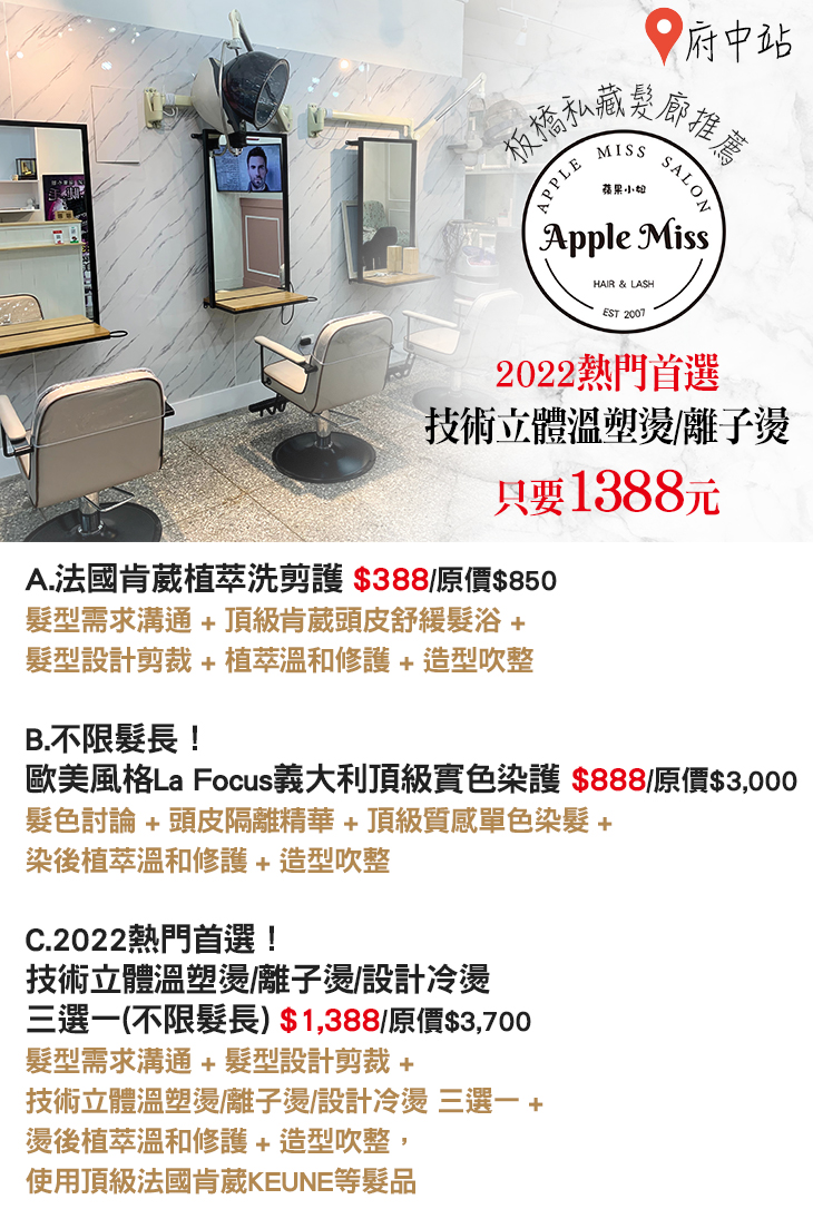 近捷運府中站,交通十分便利的【蘋果小姐沙龍】,讓習慣搭乘大眾運輸通勤的小資女孩,也能夠輕鬆前往,享受美麗!溫馨、典雅的空間,乾淨又舒適,讓您安心體驗多元的美髮方案!專業且深厚的手藝,搭配頂級品牌產品,為您打造最完美的造型,讓您盡情展現專屬的個人魅力~還在為了美麗而煩惱嗎?事不宜遲,現在就預約前往,讓自己好好美一波吧!