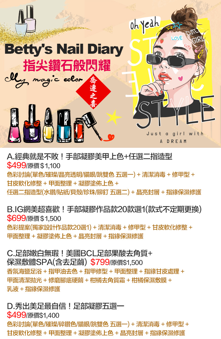 A.經典就是不敗!手部凝膠美甲上色+任選二指造型 / B.IG網美超喜歡!手部凝膠作品款20款選1(款式不定期更換) / C.足部嫩白無瑕!美國BCL足部果酸去角質+保濕敷體SPA(含去足繭) / D.秀出美足最自信!足部凝膠五選一