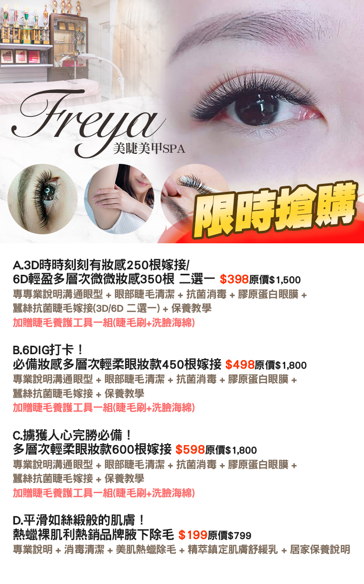 A.3D時時刻刻有妝感250根嫁接/6D輕盈多層次微微妝感350根 二選一 / B.6DIG打卡!必備妝感多層次輕柔眼妝款450根嫁接 / C.擄獲人心完勝必備!多層次輕柔眼妝款600根嫁接 / D.平滑如絲緞般的肌膚!熱蠟裸肌利熱銷品牌腋下除毛