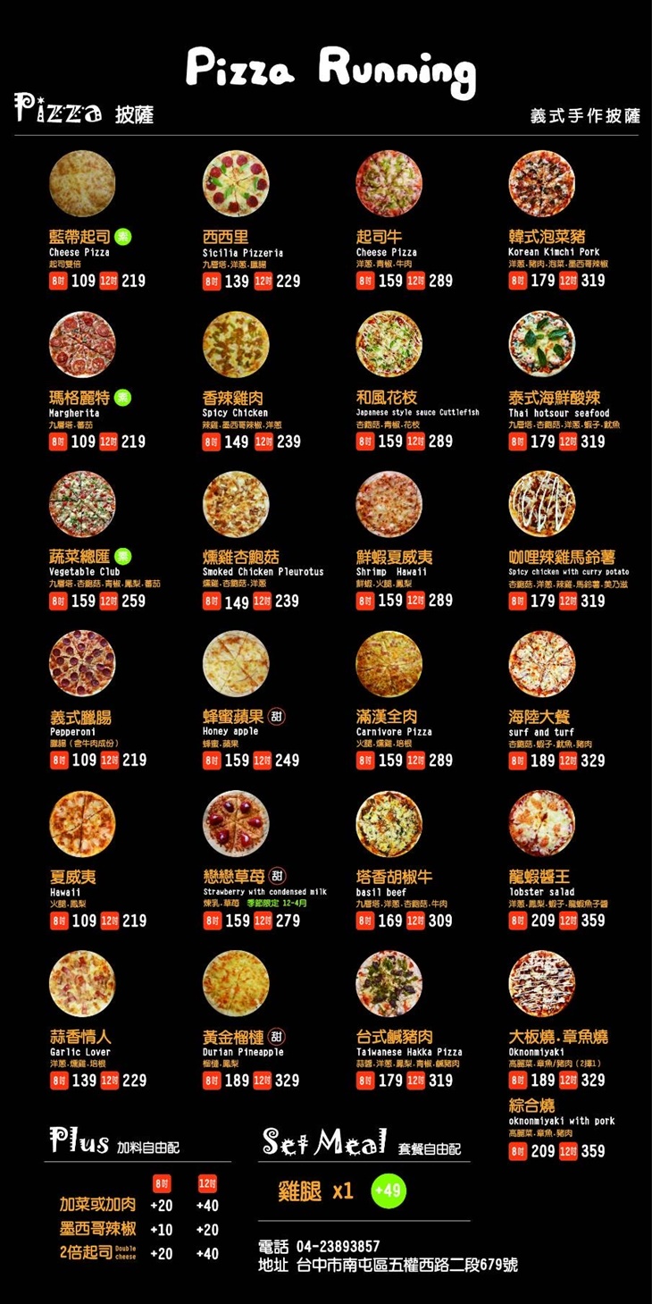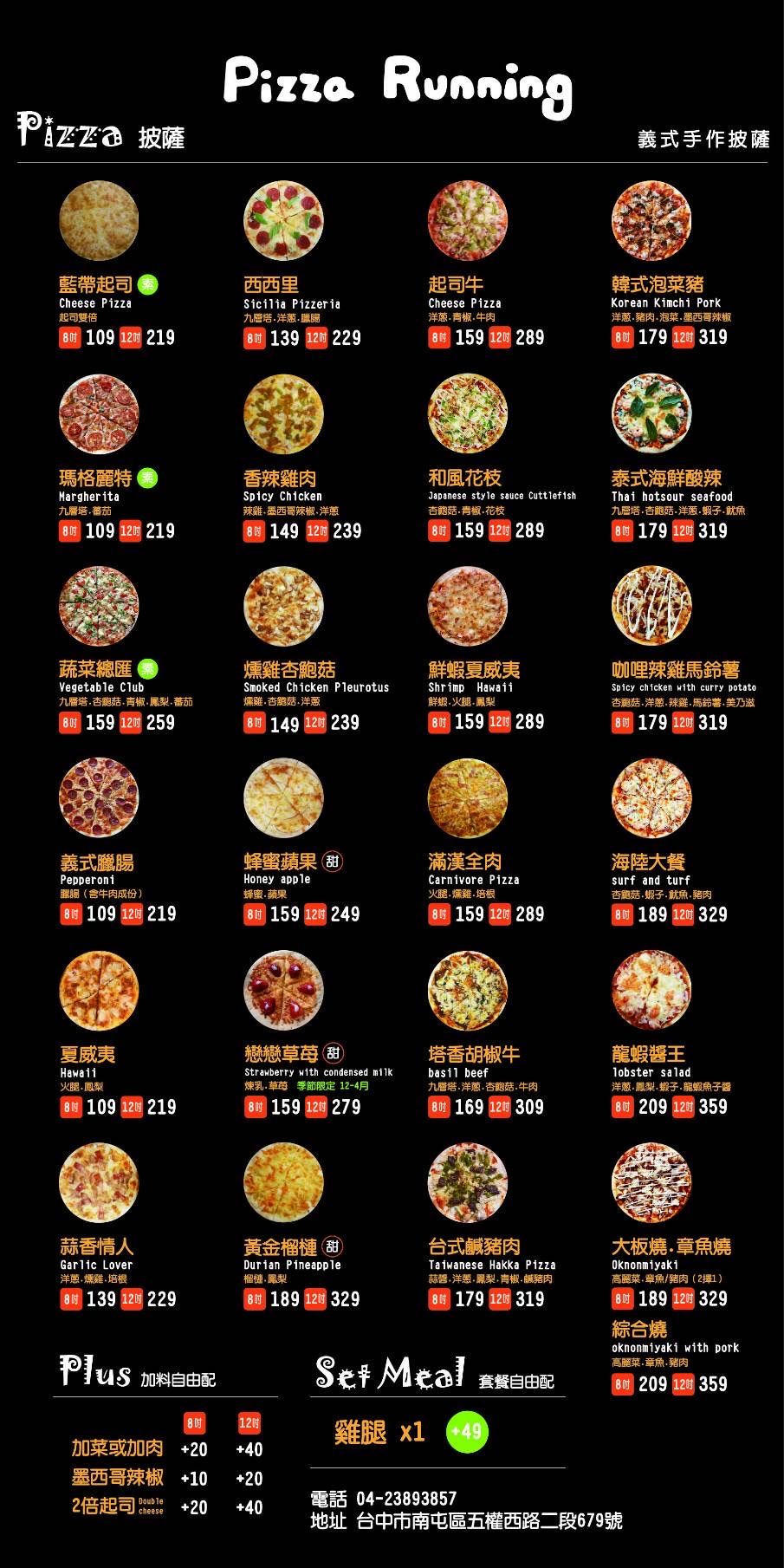 來到【Pizza Running】享受著義式經典披薩,體驗漫步在南歐的輕快與悠閒,為生活增添歡樂色彩!【Pizza Running】提供多樣以新鮮食材製作而成的美味披薩,口味超豐富,讓您享用美味餐點如走入美麗田園,清新自然的香氣給您最純粹美好的享受!