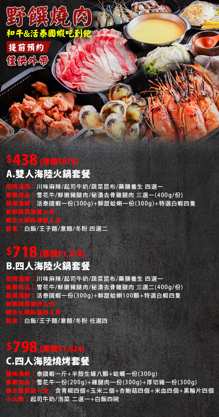 ※本優惠僅供外帶(火鍋為生鮮外帶,燒烤為熟食外帶),實際包裝方式以現場為主。
