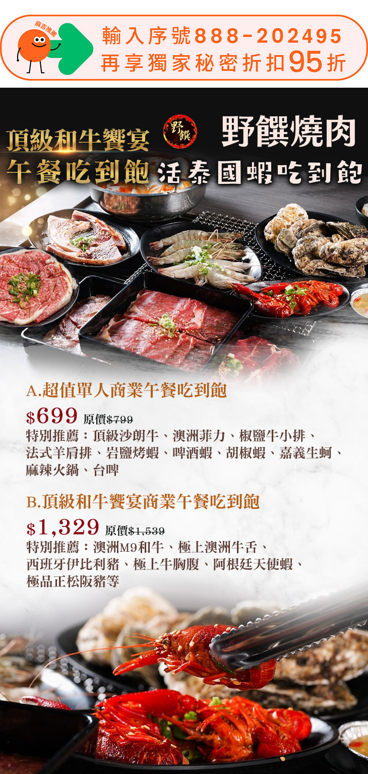 【野饌燒肉 和牛&活泰國蝦吃到飽】感謝麻吉們熱烈搶購,已全數賣光光。