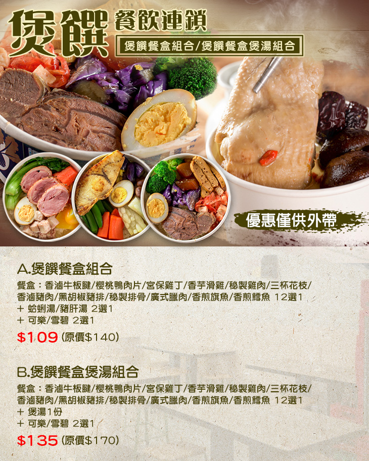 〈餐盒:香滷牛板腱/櫻桃鴨肉片/宮保雞丁/香芋滑雞/秘製雞肉/三杯花枝/香滷豬肉/黑胡椒豬排/秘製排骨/廣式臘肉/香煎旗魚/香煎鱈魚 12選1 + 煲湯1份 + 可樂/雪碧 2選1〉