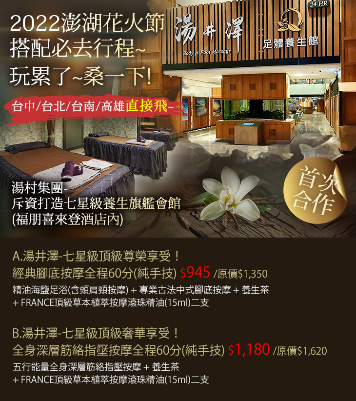 由知名【湯村集團企業】斥資打造的七星級養生旗艦會館-【湯井澤足體養生館(澎湖館)】,位於澎湖【福朋喜來登酒店】內,空間寬敞、裝潢奢華,完善的硬體設備,加上陣容堅強的按摩師傅群,給予您最頂級的舒壓體驗~讓您在這寬廣的休憩空間中,渡過專屬的休閒時光,彷彿如釋重負、心曠神怡!