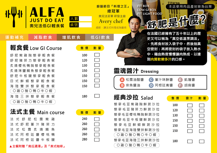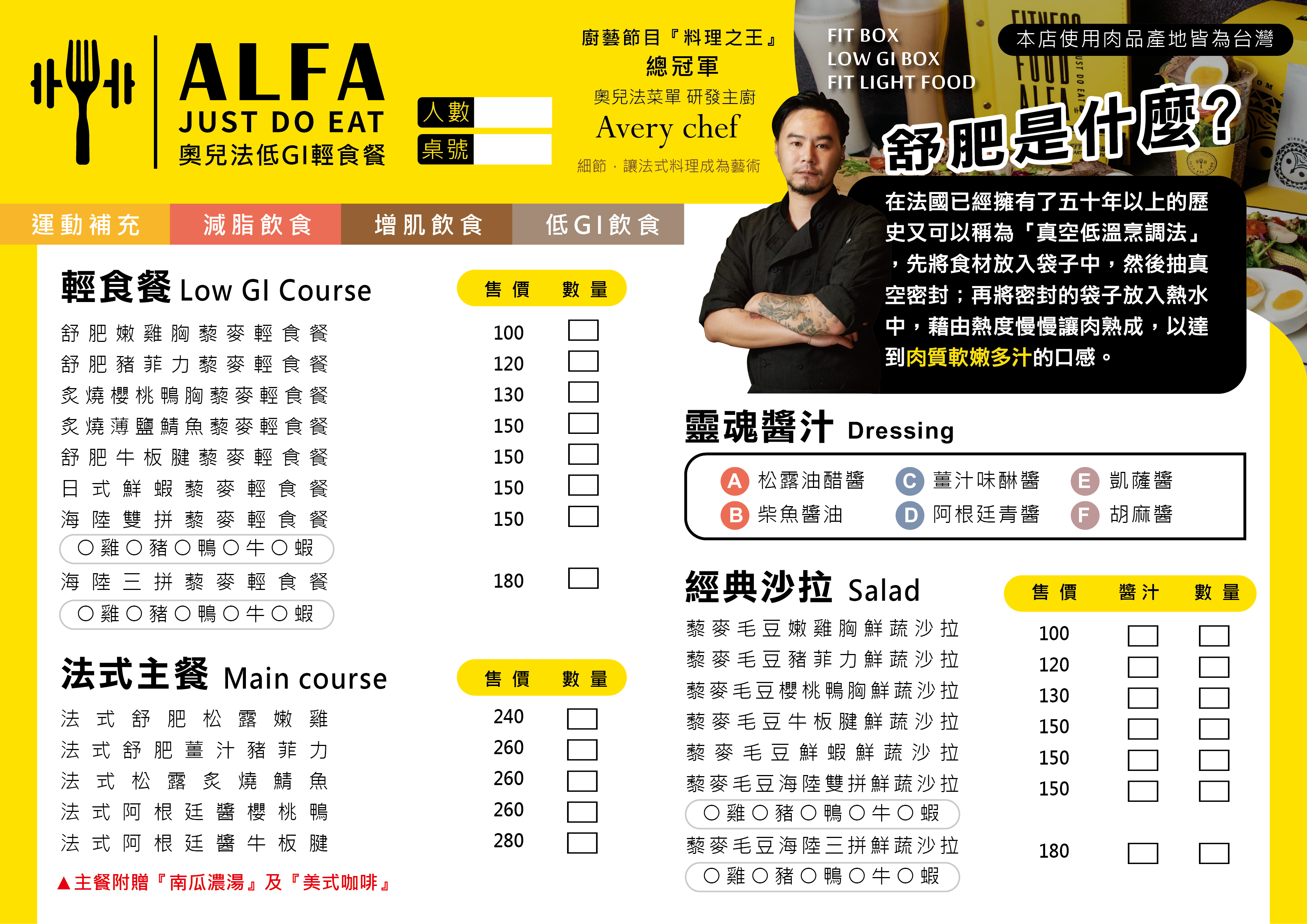 現代人養生意識抬頭,紛紛追求健康飲食,為了讓您的飲食更加均衡無負擔,店家特別邀請法、義、日 三大主廚與專業營養師,聯手打造奧兒法輕食健身餐。以法式手法烹調出美味的營養健身餐點,比起一般水煮健身餐更豐富多變,提供給追求健康的您一個最佳選擇。完美演繹美味與健康,享受最純粹的滋味,淨化味蕾的「天然食」,輕鬆享受食物原始鮮、甘、甜!