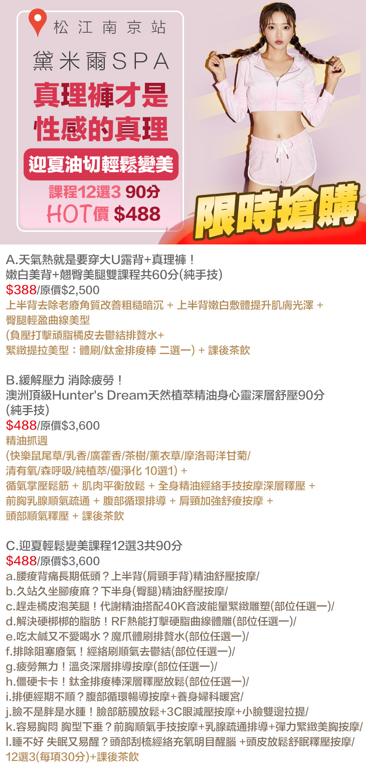 A.天氣熱就是要穿大U露背+真理褲!嫩白美背+翹臀美腿雙課程共60分(純手技) / B.緩解壓力 消除疲勞!澳洲頂級Hunter's Dream天然植萃精油身心靈深層舒壓90分(純手技) / C.迎夏輕鬆變美課程12選3共90分
