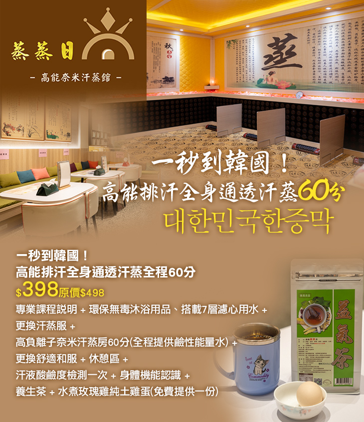 〈專業課程說明 + 環保無毒沐浴用品、搭載7層濾心用水 + 更換汗蒸服 + 高負離子奈米汗蒸房60分(全程提供鹼性能量水) + 更換舒適和服 + 休憩區 + 汗液酸鹼度檢測一次 + 身體機能認識 + 養生茶 + 水煮玫瑰雞純土雞蛋(免費提供一份)〉