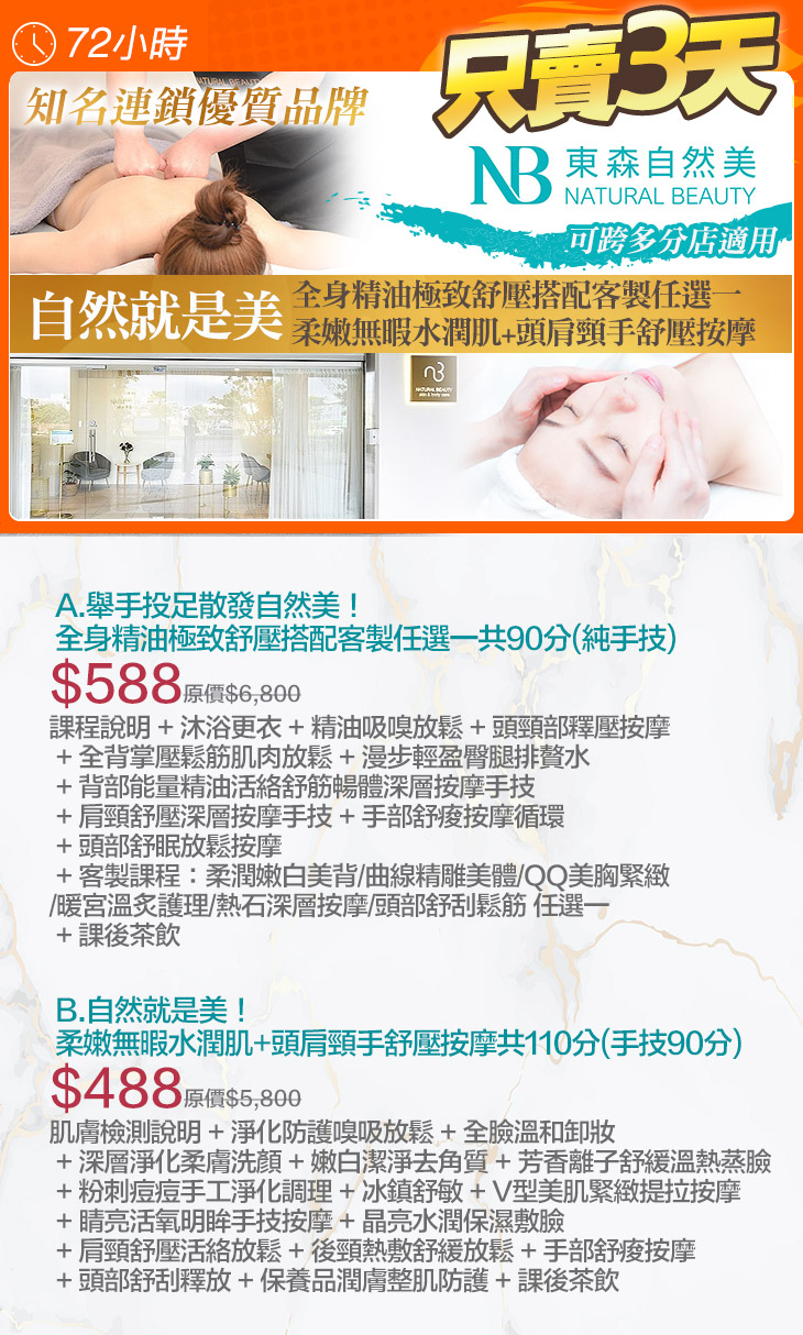 A.舉手投足散發自然美!全身精油極致舒壓搭配客製任選一共90分(純手技) / B.自然就是美!柔嫩無暇水潤肌+頭肩頸手舒壓按摩共110分(手技90分)