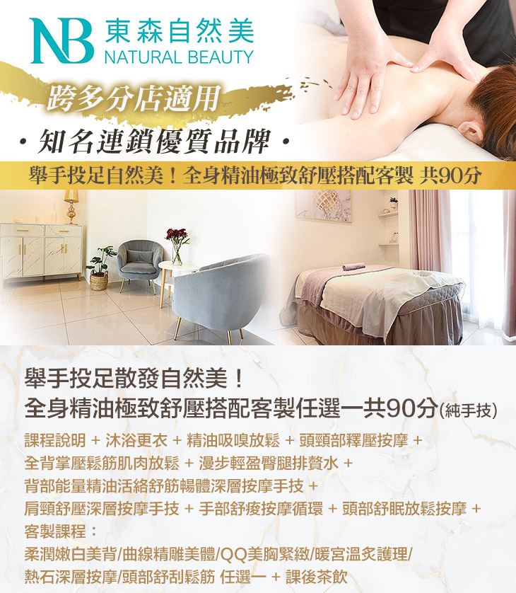 〈課程說明 + 沐浴更衣 + 精油吸嗅放鬆 + 頭頸部釋壓按摩 + 全背掌壓鬆筋肌肉放鬆 + 漫步輕盈臀腿排贅水 + 背部能量精油活絡舒筋暢體深層按摩手技 + 肩頸舒壓深層按摩手技 + 手部舒痠按摩循環 + 頭部舒眠放鬆按摩 + 客製課程:柔潤嫩白美背/曲線精雕美體/QQ美胸緊緻/暖宮溫炙護理/熱石深層按摩/頭部舒刮鬆筋 任選一 + 課後茶飲〉