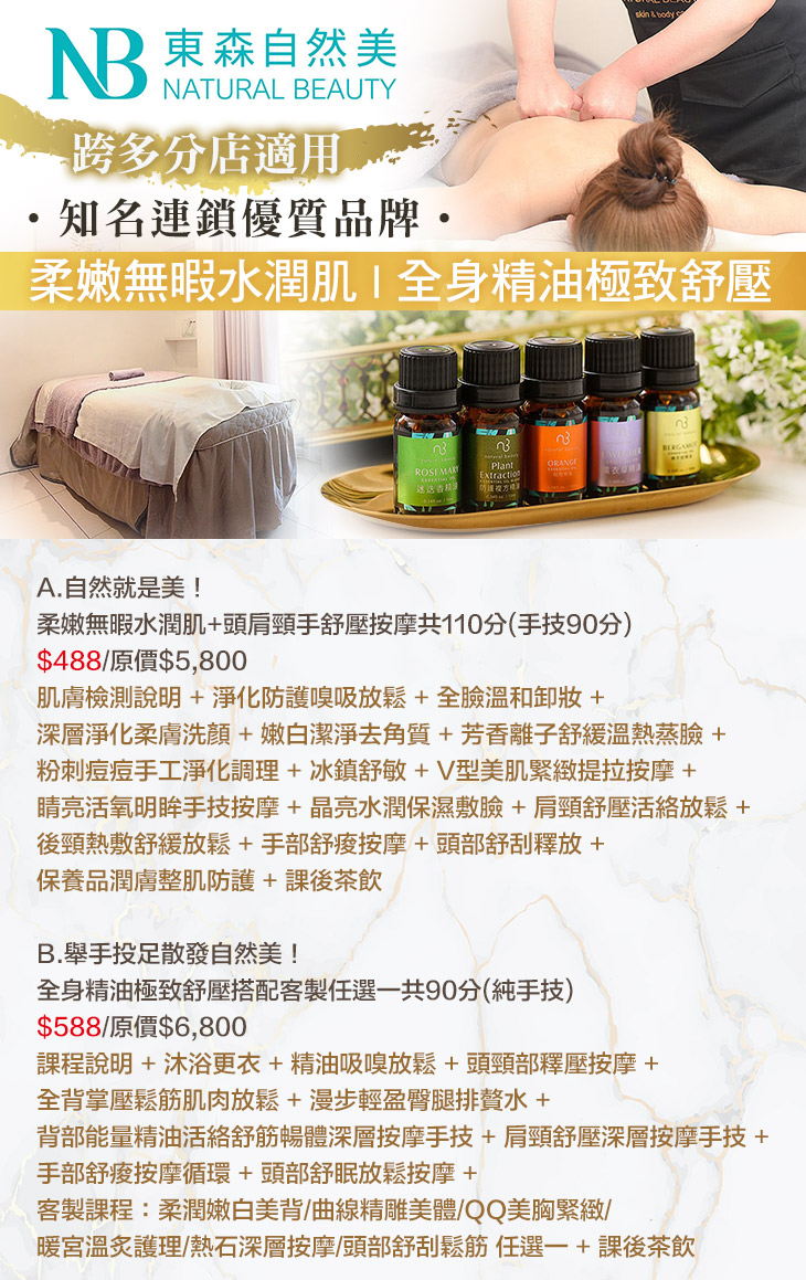 A.自然就是美!柔嫩無暇水潤肌+頭肩頸手舒壓按摩共110分(手技90分) / B.舉手投足散發自然美!全身精油極致舒壓搭配客製任選一共90分(純手技)
