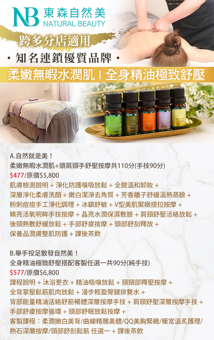 A.自然就是美!柔嫩無暇水潤肌+頭肩頸手舒壓按摩共110分(手技90分) / B.舉手投足散發自然美!全身精油極致舒壓搭配客製任選一共90分(純手技)