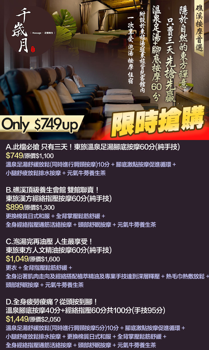 A.此檔必搶 只有三天!東旅溫泉足湯腳底按摩60分(純手技) / B.礁溪頂級養生會館 雙館聯賣!東旅漢方經絡指壓按摩60分(純手技) / C.泡湯完再油壓 人生最享受!東旅東方人文精油按摩60分(純手技) / D.全身疲勞痠痛?從頭按到腳!溫泉腳底按摩40分+經絡指壓60分共100分(手技95分)