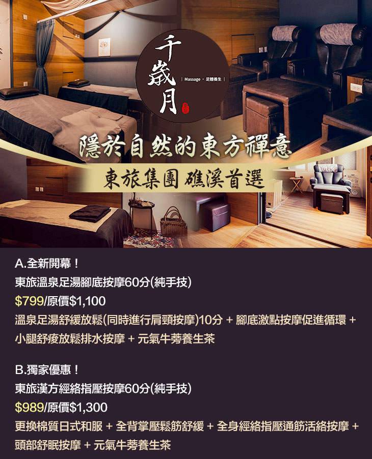 現代人工作忙碌,生活壓力日與劇增,放鬆身心的養生按摩或許是您最佳的選擇!【千歲月】融入了古今中外的養生之法,以天然精油為始,獨特漢方手法為名,為超過萬名顧客提供舒緩身心、活躍經絡的養生療程。推出腳底按摩、經絡指壓及精油按摩等多元課程,讓喜愛按摩的客人們,擁有更全方位的服務,不僅能夠舒緩您疲憊的身心,更能快速恢復您的精氣神,迎接更美好的每一天!歡迎您與親友們一起來體驗喔!