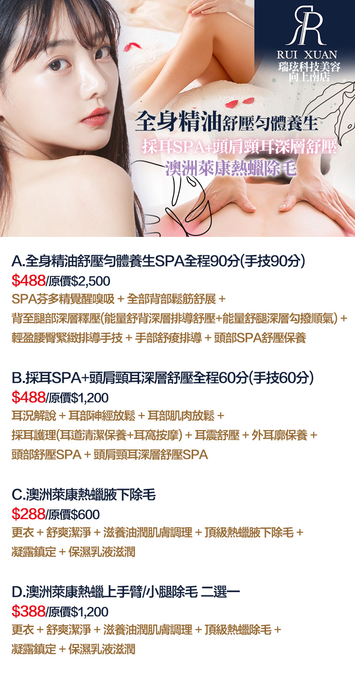 A.全身精油舒壓勻體養生SPA全程90分(手技90分) / B.採耳SPA+頭肩頸耳深層舒壓全程60分(手技60分) / C.澳洲萊康熱蠟腋下除毛 / D.澳洲萊康熱蠟上手臂/小腿除毛 二選一