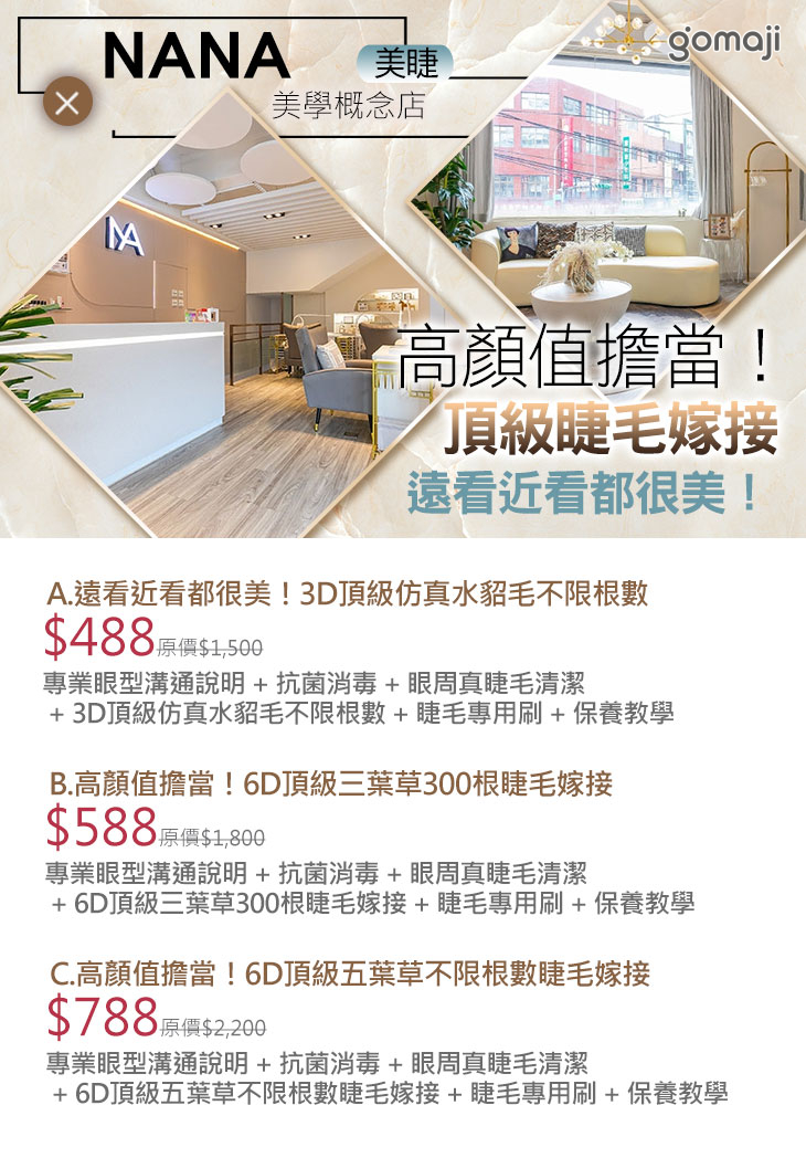 迷人的美睫,打造水亮靈動的眼神!【NANA美學概念店】為愛美的女孩提供專業的美睫、蜜蠟除毛服務,精細的睫毛嫁接,難不倒專業老師的雙手!榮獲多項獎項與證照認證的技術十分精湛,為您用心施作每一個步驟,一刻都不馬虎,讓您享受最尊榮的美麗服務!