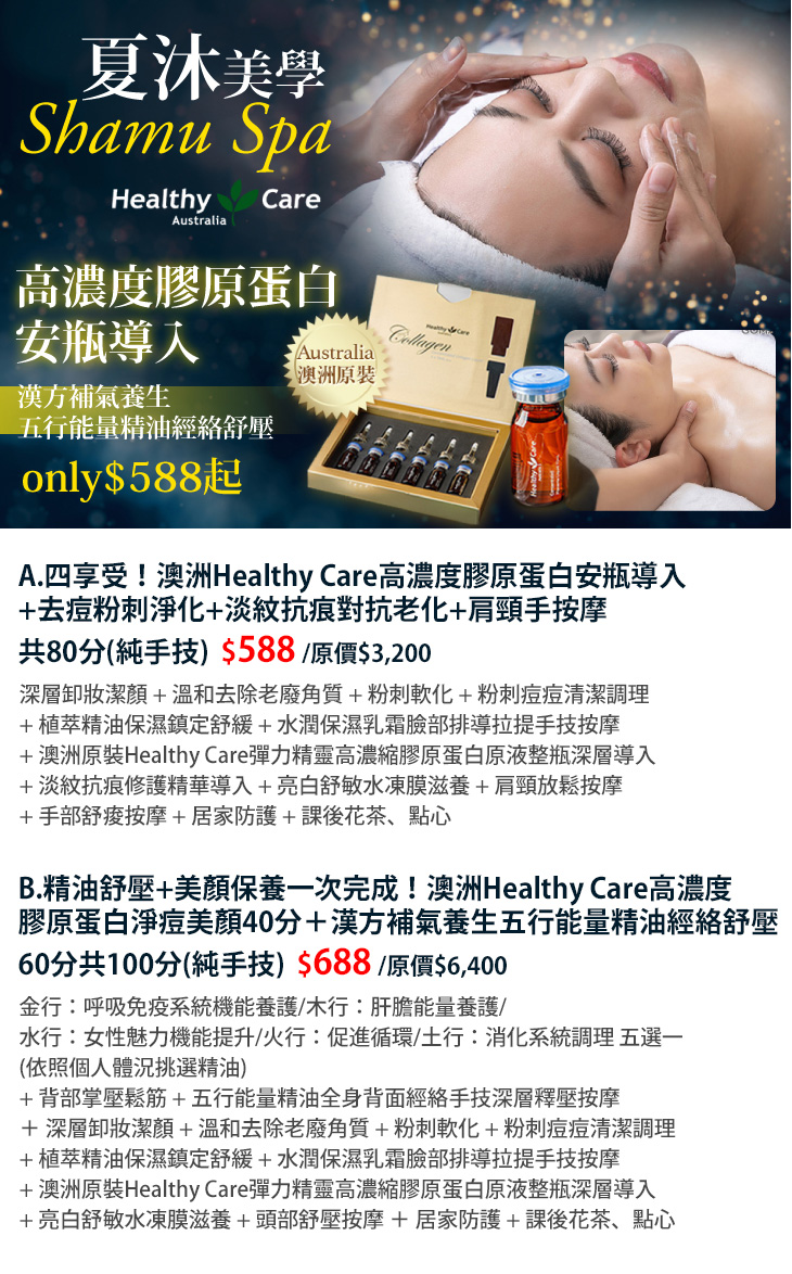 A.四享受!澳洲Healthy Care高濃度膠原蛋白安瓶導入+去痘粉刺淨化+淡紋抗痕對抗老化+肩頸手按摩共80分(純手技) / B.精油舒壓+美顏保養一次完成!澳洲Healthy Care高濃度膠原蛋白淨痘美顏40分+漢方補氣養生五行能量精油經絡舒壓60分共100分(純手技)