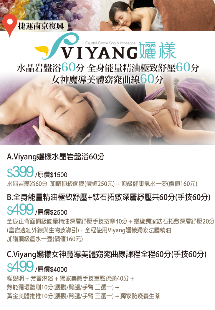 A.Viyang孋樣水晶岩盤浴60分 / B.全身能量精油極致舒壓+鈦石拓敷深層紓壓共60分(手技60分) / C.Viyang孋樣女神魔導美體窈窕曲線課程全程60分(手技60分)