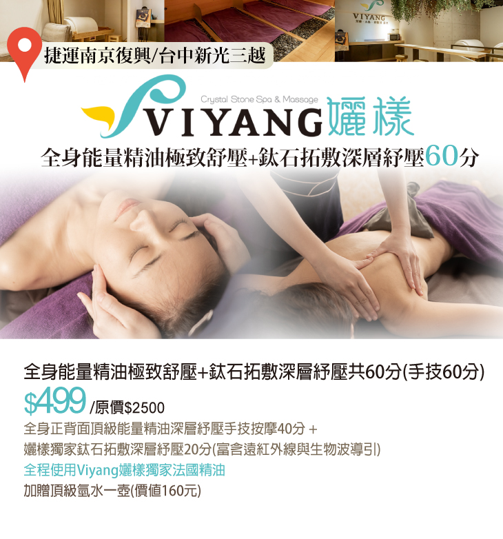 〈全身正背面頂級能量精油深層紓壓手技按摩40分 + 孋樣獨家鈦石拓敷深層紓壓20分(富含遠紅外線與生物波導引),全程使用Viyang孋樣獨家法國精油〉加贈頂級氫水一壺(價值160元)