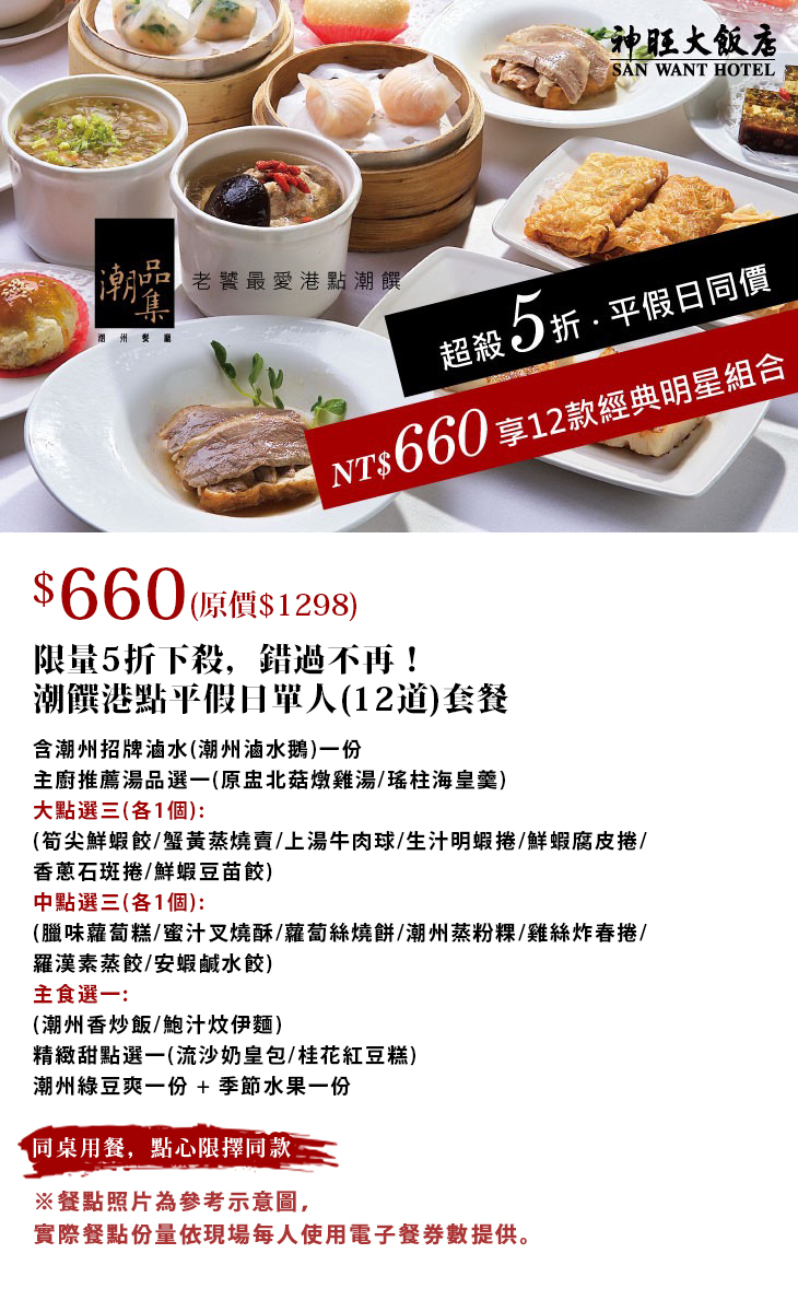 馳名中餐廳潮品集提供道地潮州料理與各樣港式小點;揉合在地台灣味與經典港點元素而成的精緻佳餚,在選料及各式點心外皮處處展現紮實真功夫,堅持純手工展現食材原味。一券在手,盡享經典超人氣港點與潮州美饌。