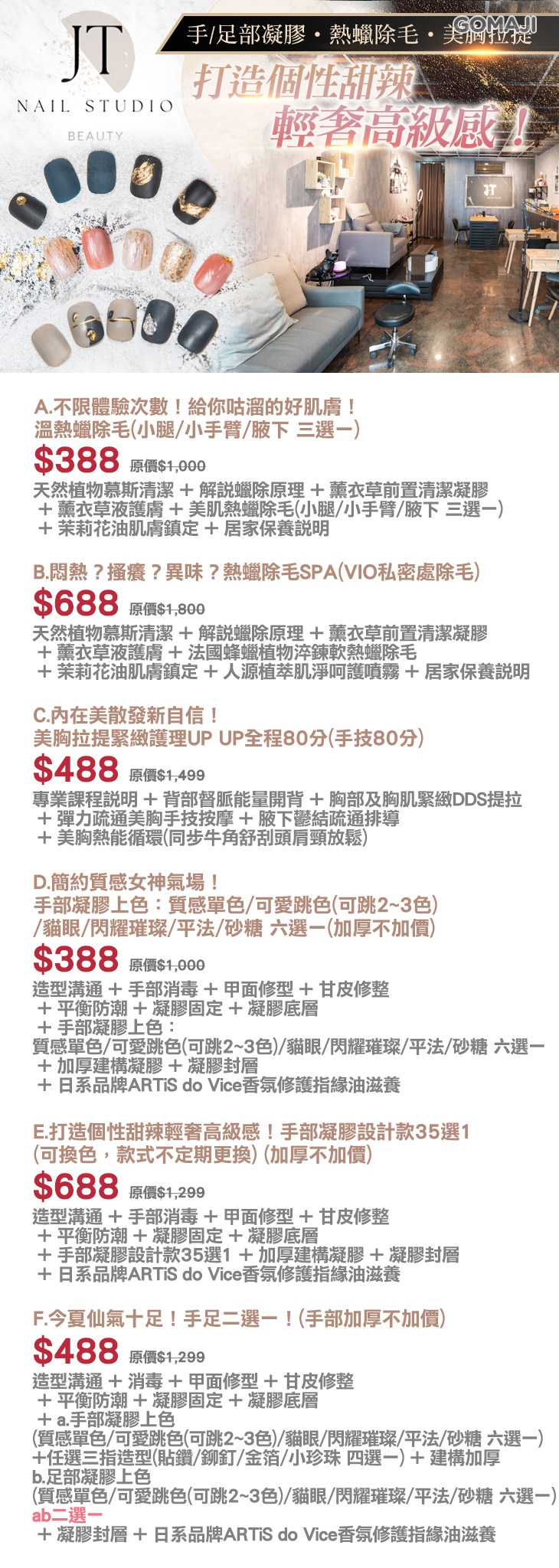 A.不限體驗次數!給你咕溜的好肌膚!溫熱蠟除毛(小腿/小手臂/腋下 三選一)/B.悶熱?搔癢?異味?熱蠟除毛SPA(VIO私密處除毛)/C.內在美散發新自信!美胸拉提緊緻護理UP UP全程80分(手技80分)/D.簡約質感女神氣場!手部凝膠上色:質感單色/可愛跳色(可跳2~3色)/貓眼/閃耀璀璨/平法/砂糖 六選一(加厚不加價)/E.打造個性甜辣輕奢高級感!手部凝膠設計款35選1(可換色,款式不定期更換) (加厚不加價)/F.今夏仙氣十足!手足二選一!