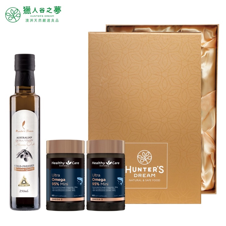年節禮盒 | 健康雙油禮盒組〈內含:初榨橄欖油 1瓶(250ml) + 超級 Omega-3 95% 迷你魚油膠囊 2瓶(60顆/瓶)〉