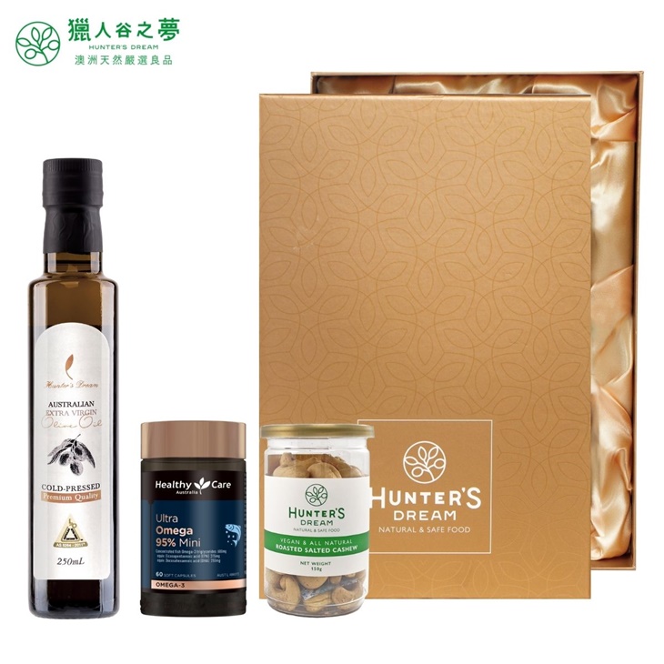 年節禮盒 | Omega 3/6/9 健康好油禮盒組〈內含:初榨橄欖油 1瓶(250ml) + 超級 Omega-3 95% 迷你魚油膠囊 1入(60顆/入) + 澳洲鹽烤腰果 1罐(150g,罐裝)〉