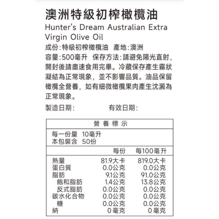 【Hunter's Dream】生飲級冷壓特級初榨橄欖油|特級初榨冷壓橄欖油 1/2入(500ml /入) (效期至2027/9/15)