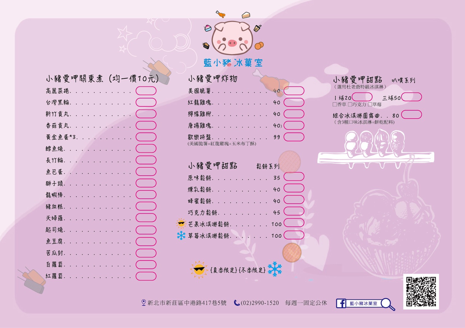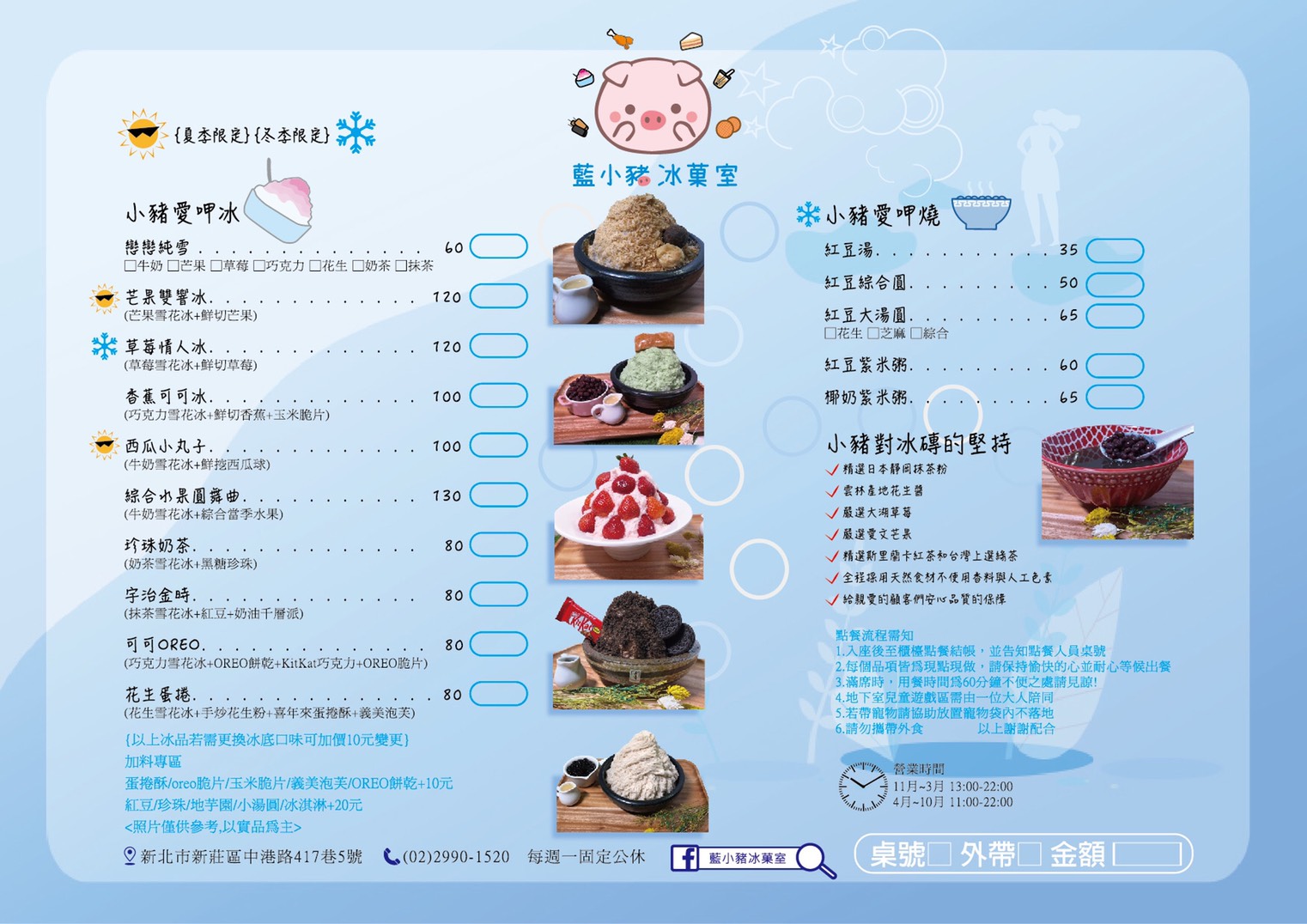 新莊首創雪花冰專賣店!堅持將「純天然、美味又健康、價格實在」三大理念帶給大家,本店主打各式雪花冰品、甜湯、炸物、鬆餅、冰淇淋、關東煮等,擁有豐富的品項選擇;慵懶午後來上一碗冰品或是一份甜點,都能讓您卸下所有的疲憊與煩憂;嘴饞時刻,【藍小豬冰菓室】也能滿足您的需求唷~關東煮與炸物也都相當受歡迎!下次經過,不妨進來坐坐,與親愛的人們一起享用,創造難忘美好的品味時光♥