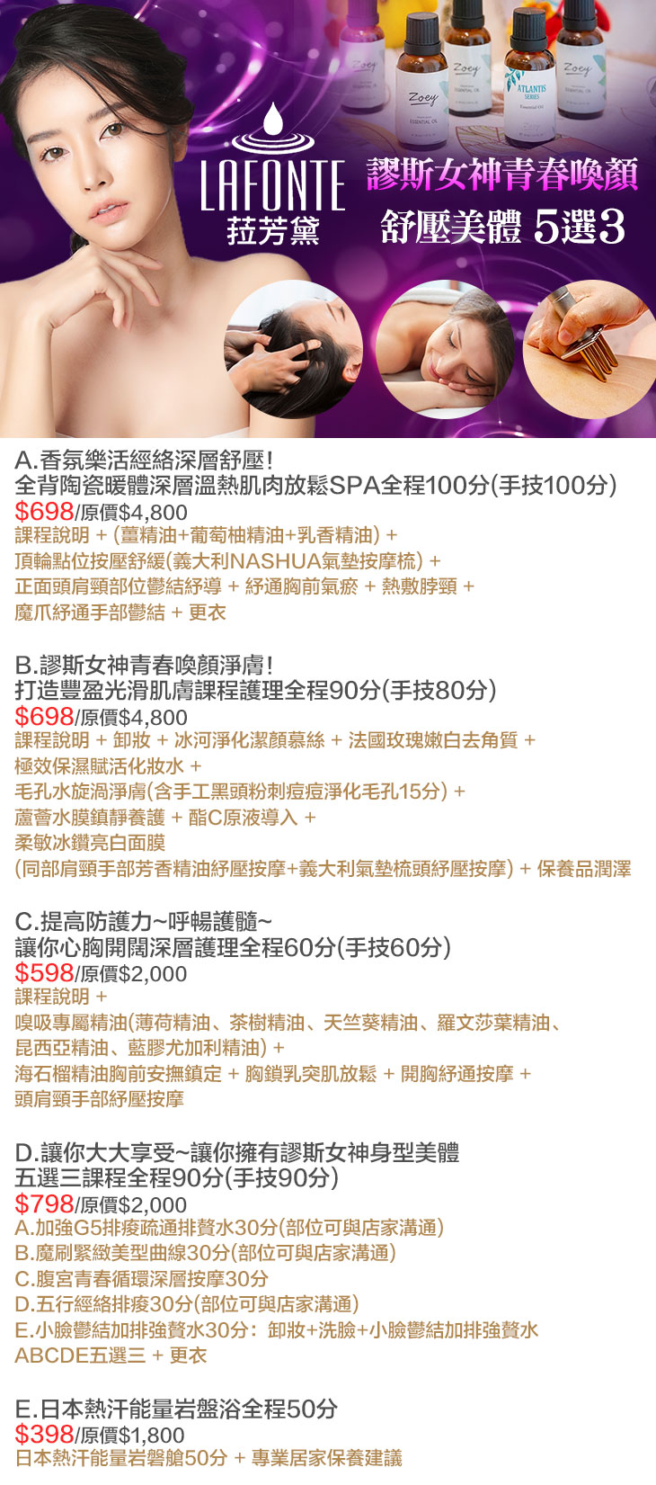 A.香氛樂活經絡深層舒壓!全背陶瓷暖體深層溫熱肌肉放鬆SPA全程100分(手技100分) / B.謬斯女神青春喚顏淨膚!打造豐盈光滑肌膚課程護理全程90分(手技80分) / C.提高防護力~呼暢護髓~讓你心胸開闊深層護理全程60分(手技60分) / D.讓你大大享受~讓你擁有謬斯女神身型美體 五選三課程全程90分(手技90分) / E.日本熱汗能量岩盤浴全程50分