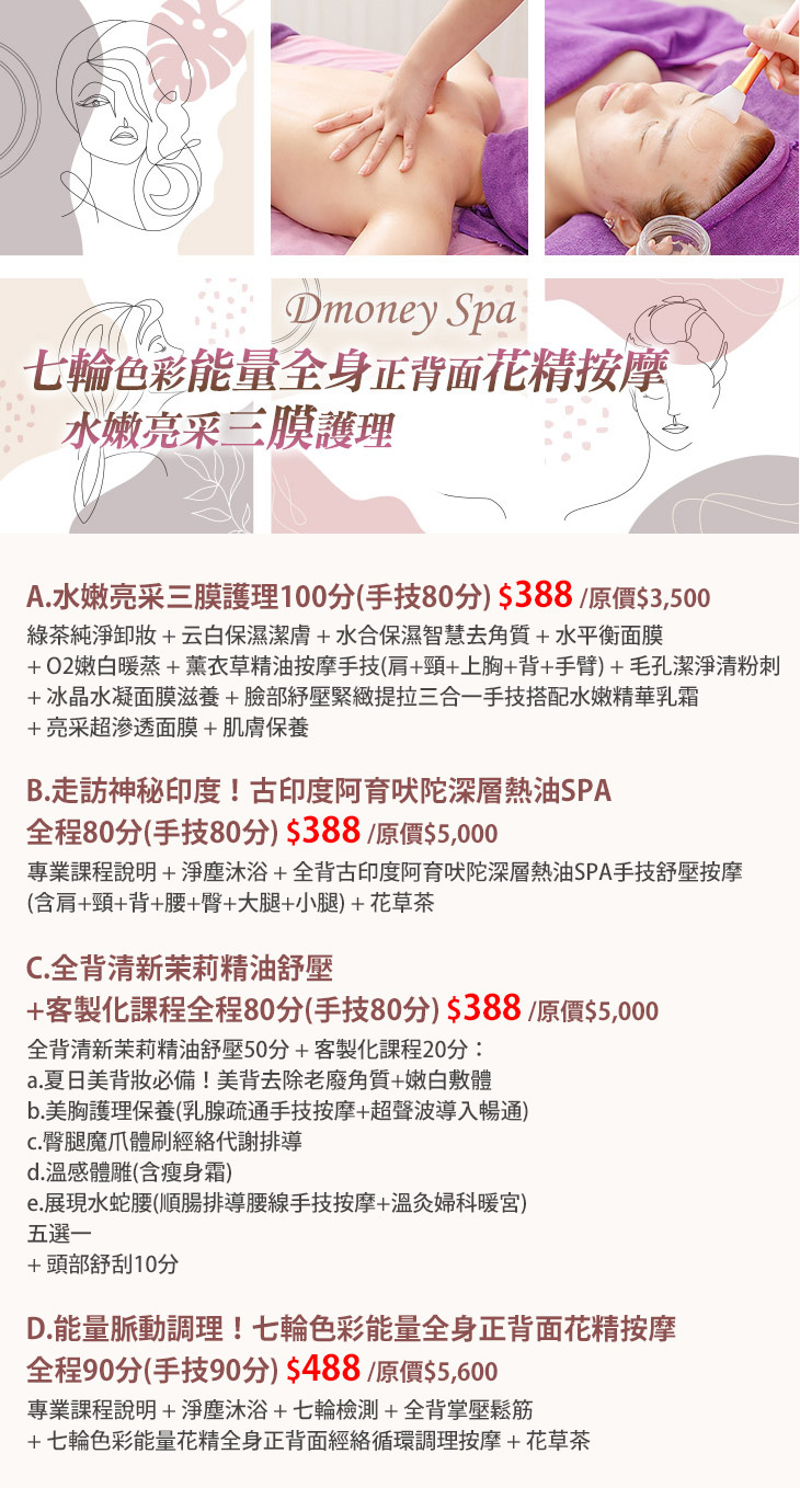 A.水嫩亮采三膜護理100分(手技80分) / B.走訪神秘印度!古印度阿育吠陀深層熱油SPA全程80分(手技80分) / C.全背清新茉莉精油舒壓+客製化課程全程80分(手技80分) / D.能量脈動調理!七輪色彩能量全身正背面花精按摩全程90分(手技90分)
