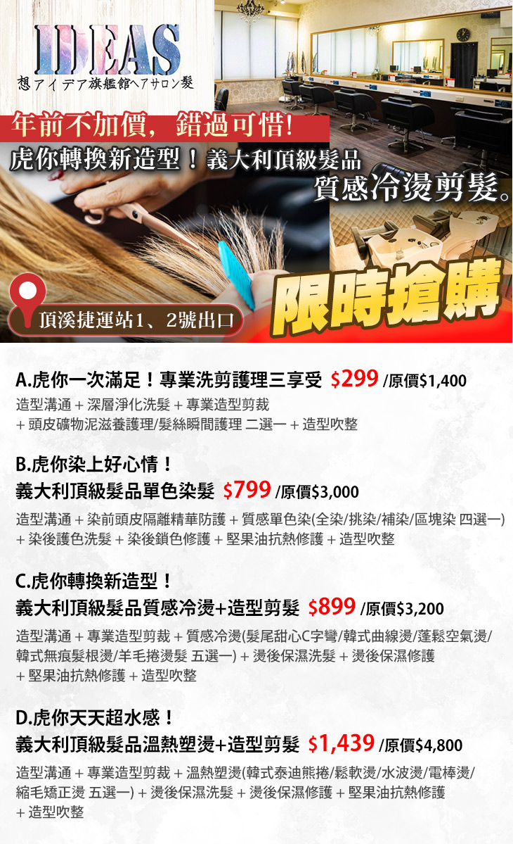 A.虎你一次滿足!專業洗剪護理三享受 / B.虎你染上好心情!義大利頂級髮品單色染髮 / C.虎你轉換新造型!義大利頂級髮品質感冷燙+造型剪髮 / D.虎你天天超水感!義大利頂級髮品溫熱塑燙+造型剪髮