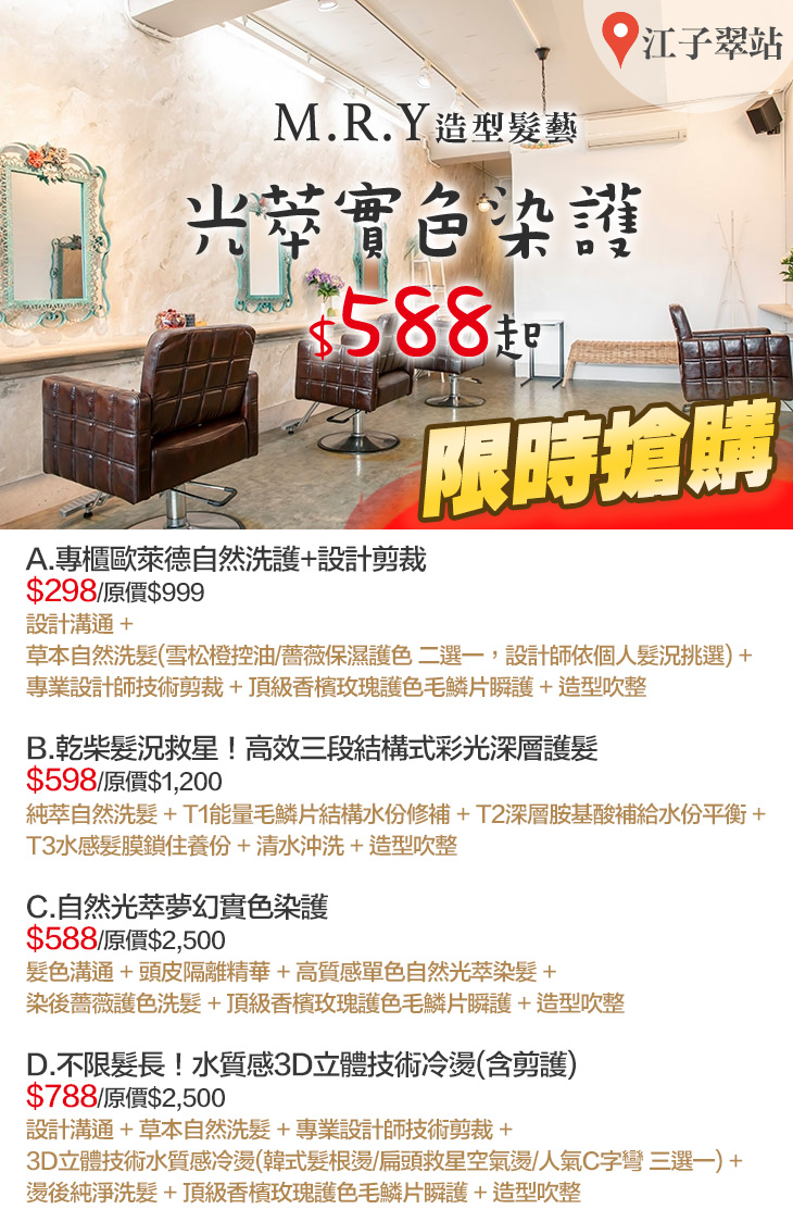 A.專櫃歐萊德自然洗護+設計剪裁 / B.乾柴髮況救星!高效三段結構式彩光深層護髮 / C.自然光萃夢幻實色染護 / D.不限髮長!水質感3D立體技術冷燙(含剪護)