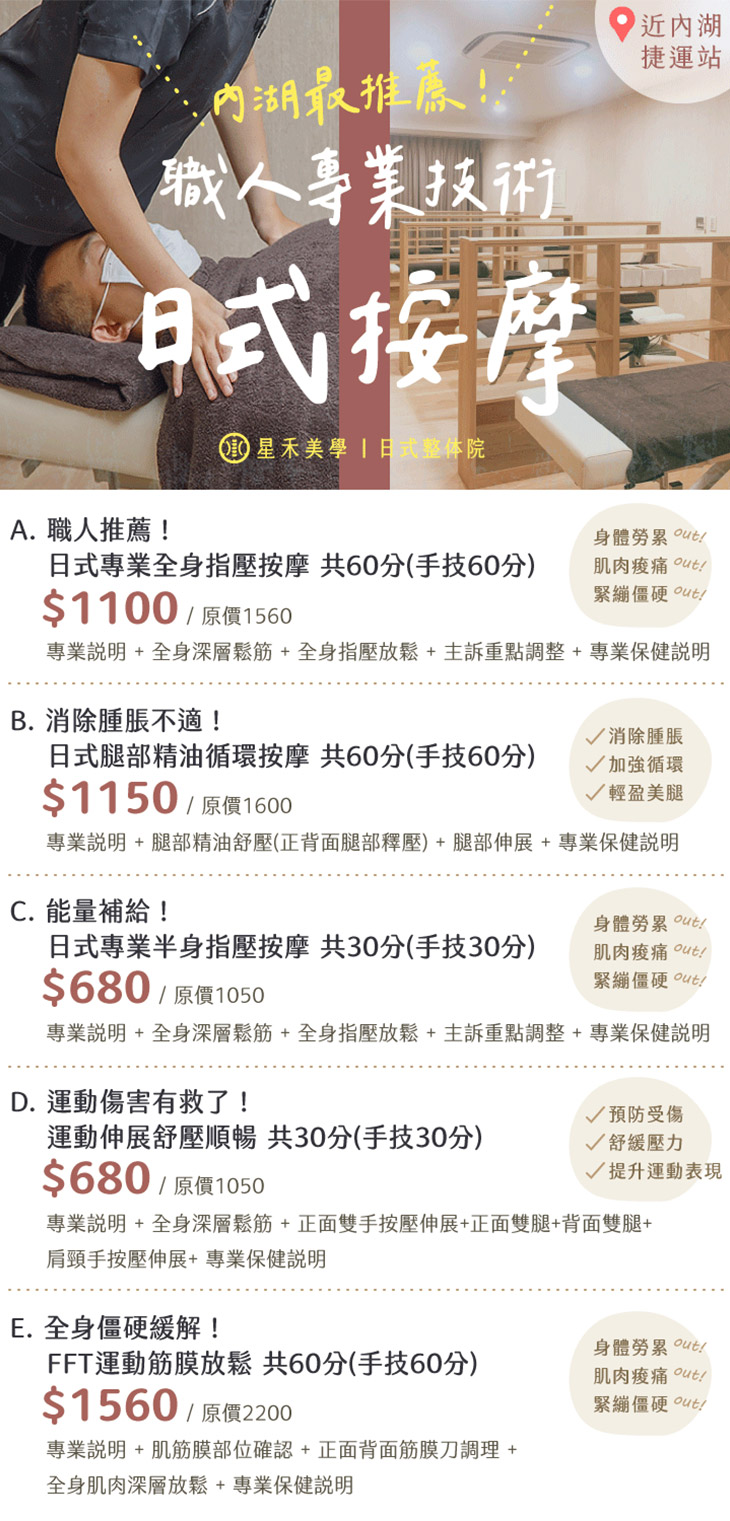 A.職人推薦!日式專業全身指壓按摩共60分(手技60分) / B.消除腫脹不適!日式腿部精油循環按摩共60分(手技60分) / C.能量補給!日式專業半身指壓按摩共30分(手技30分) / D.運動傷害有救了!運動伸展舒壓順暢共30分(手技30分) / E.全身僵硬緩解!FFT運動筋膜放鬆共60分(手技60分)