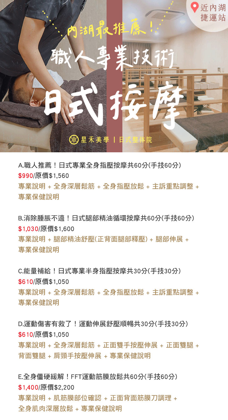 A.職人推薦!日式專業全身指壓按摩共60分(手技60分) / B.消除腫脹不適!日式腿部精油循環按摩共60分(手技60分) / C.能量補給!日式專業半身指壓按摩共30分(手技30分) / D.運動傷害有救了!運動伸展舒壓順暢共30分(手技30分) / E.全身僵硬緩解!FFT運動筋膜放鬆共60分(手技60分)