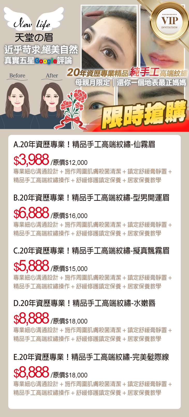 A.20年資歷專業!精品手工高端紋繡-仙霧眉 / B.20年資歷專業!精品手工高端紋繡-型男開運眉 / C.20年資歷專業!精品手工高端紋繡-擬真飄霧眉 / D.20年資歷專業!精品手工高端紋繡-水嫩唇 / E.20年資歷專業!精品手工高端紋繡-完美髮際線