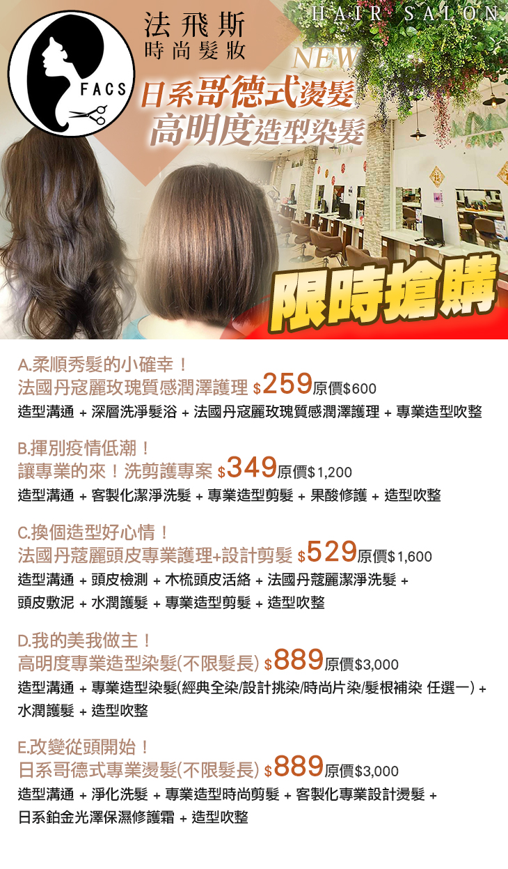 A.柔順秀髮的小確幸!法國丹寇麗玫瑰質感潤澤護理 / B.揮別疫情低潮!讓專業的來!洗剪護專案 / C.換個造型好心情!法國丹蔻麗頭皮專業護理+設計剪髮 / D.我的美我做主!高明度專業造型染髮(不限髮長) / E.改變從頭開始!日系哥德式專業燙髮(不限髮長)