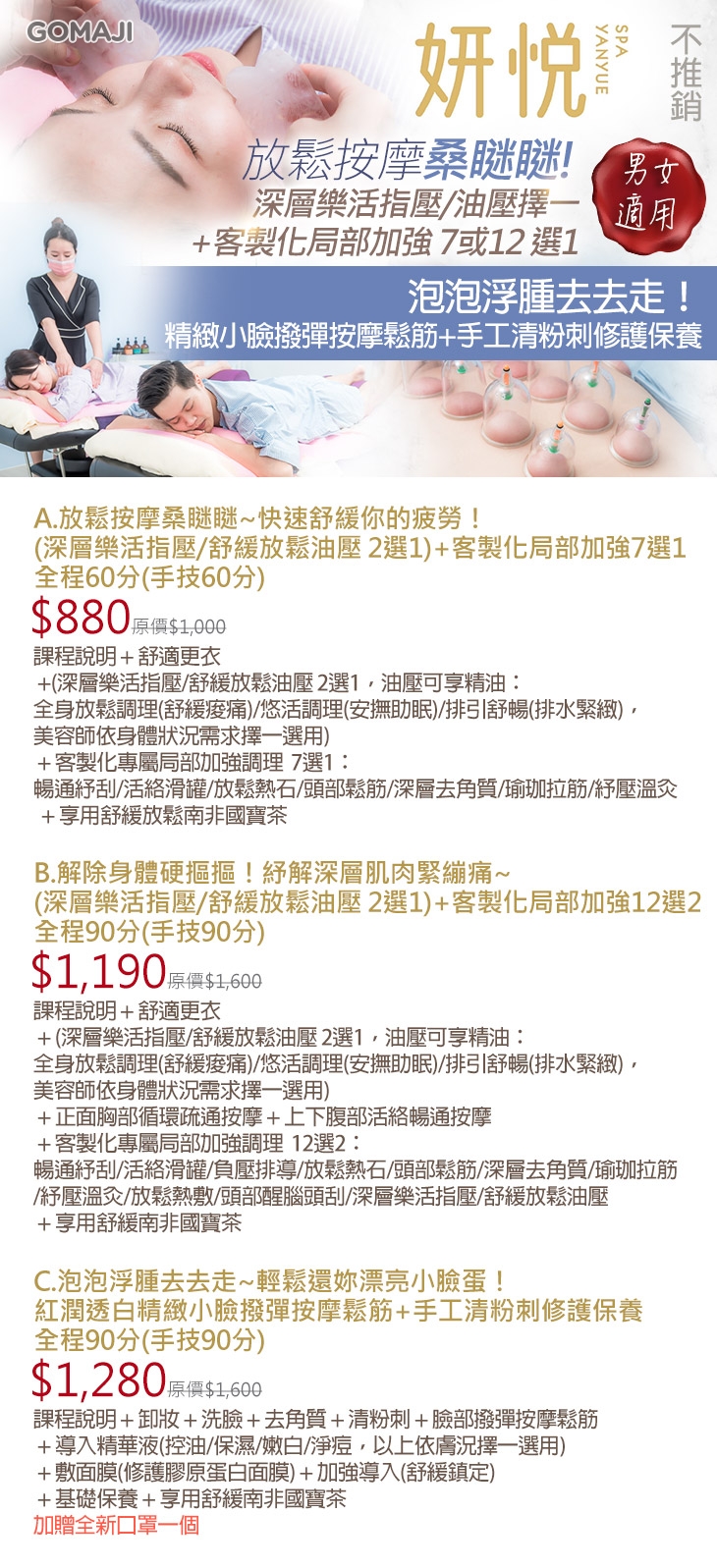 A.放鬆按摩桑瞇瞇~快速舒緩你的疲勞!(深層樂活指壓/舒緩放鬆油壓 2選1)+客製化局部加強7選1全程60分(手技60分) / B.解除身體硬摳摳!紓解深層肌肉緊繃痛~(深層樂活指壓/舒緩放鬆油壓 2選1)+客製化局部加強12選2全程90分(手技90分) / C.泡泡浮腫去去走~輕鬆還妳漂亮小臉蛋!紅潤透白精緻小臉撥彈按摩鬆筋+手工清粉刺修護保養全程90分(手技90分)