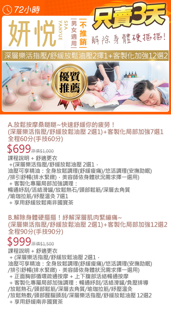 A.放鬆按摩桑瞇瞇~快速舒緩你的疲勞!(深層樂活指壓/舒緩放鬆油壓 2選1)+客製化局部加強7選1全程60分(手技60分) / B.解除身體硬摳摳!紓解深層肌肉緊繃痛~(深層樂活指壓/舒緩放鬆油壓 2選1)+客製化局部加強12選2全程90分(手技90分)