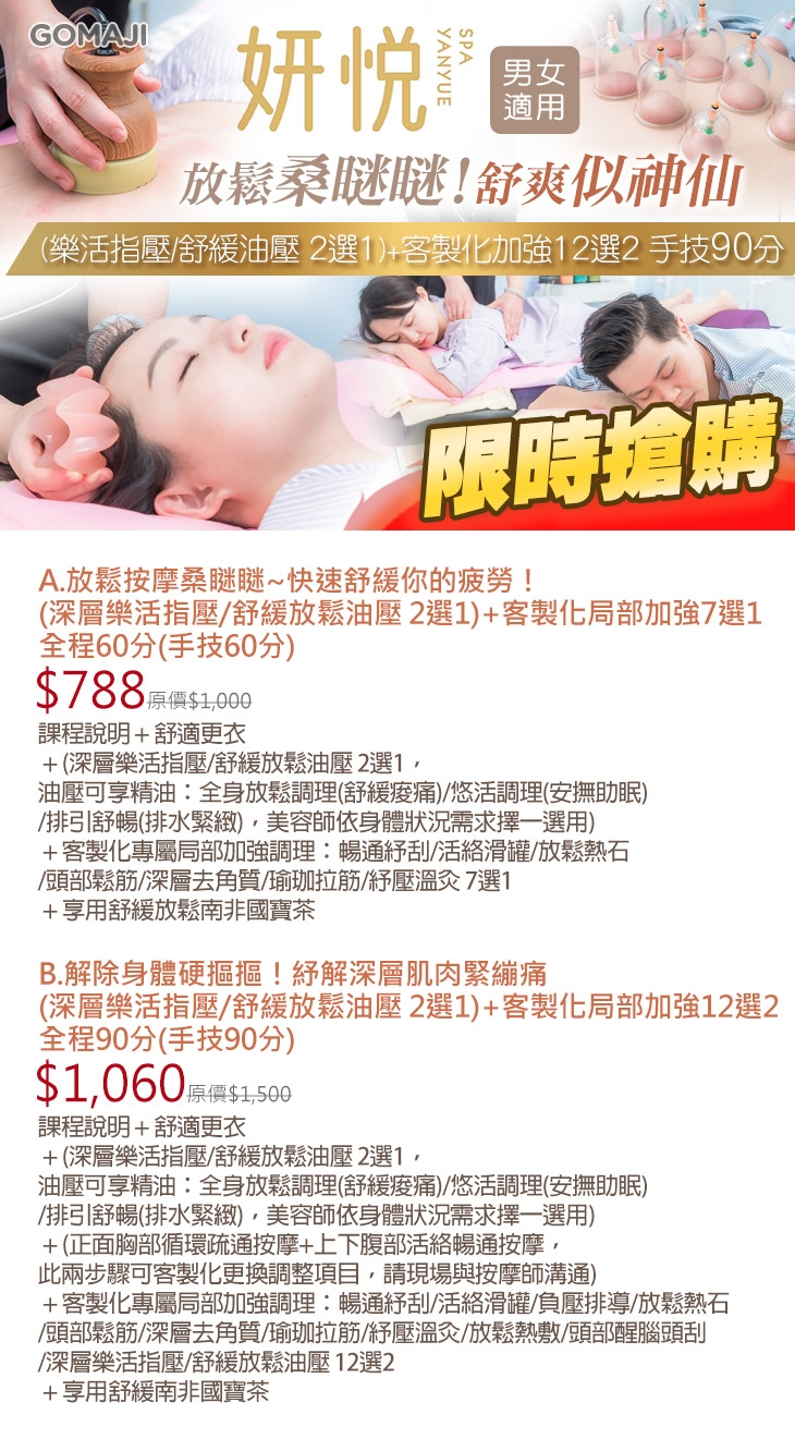 A.放鬆按摩桑瞇瞇~快速舒緩你的疲勞!(深層樂活指壓/舒緩放鬆油壓 2選1)+客製化局部加強7選1全程60分(手技60分) / B.解除身體硬摳摳!紓解深層肌肉緊繃痛(深層樂活指壓/舒緩放鬆油壓 2選1)+客製化局部加強12選2全程90分(手技90分)