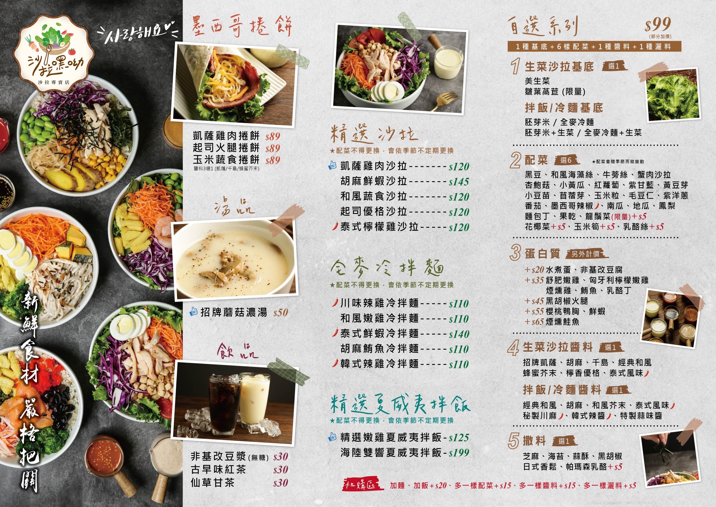 主打健康、養生的沙拉餐食,嚴選各式新鮮的生菜與食材,手工製作一份又一份口味清爽、份量恰到好處的餐點,讓您吃飽同時也能維持輕盈無負擔的狀態!不只是增肌減脂族的最愛,也是養生族群的最佳選擇!